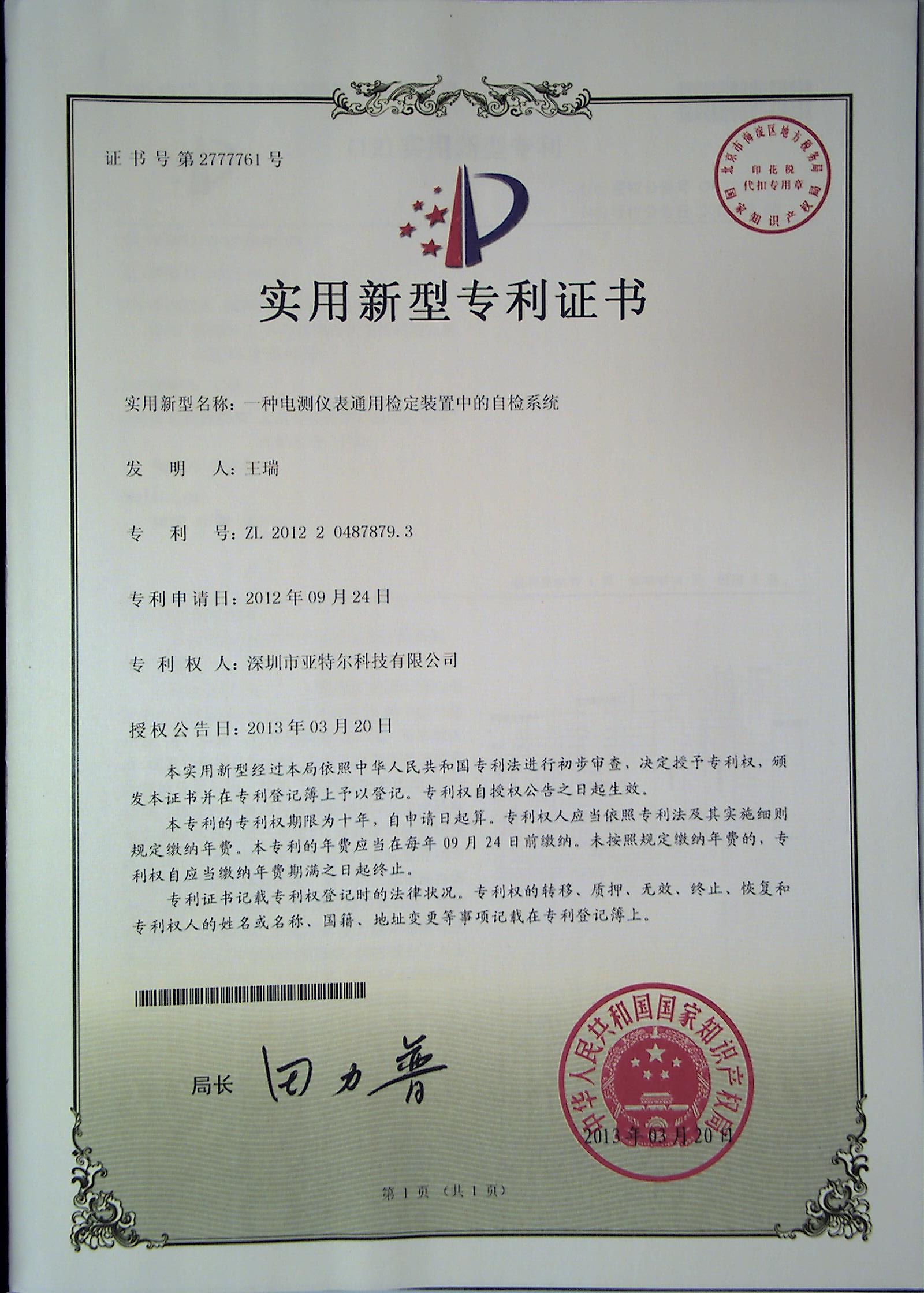 日前,公司连续接到国家知识产权局《实用新型专利证书》,我公司申报的“一种电能质量分析仪中的电能质量采集系统”和“一种电测仪表通用检定装置中的自检系统”分别获得国家知识产权局实用新型专利证书,这标志着公司产品的技术水平和技术进步工作达到了新的高度。